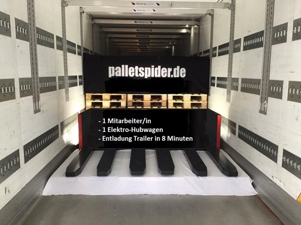 .... mit dem PalletSpider® entladen Sie einen Auflieger mit 33 Europaletten in nur 8 Minuten. Führen Sie Paletten- kommissionierung und Lagerbewegung in der Intralogistik mit dreifacher Geschwindigkeit aus.